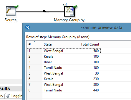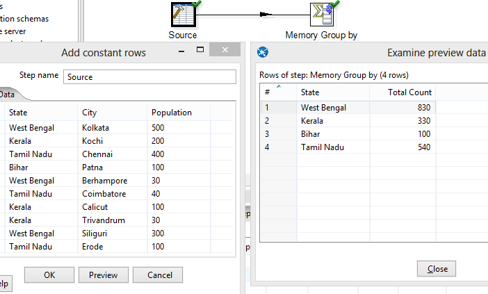 Let us assume, we have an transformation with simple data set having population count of states in India city wise. We need to get the total population count. We build a simple transformation file using Memory Group By Step and group the source data on the basis of State to get the total population count.