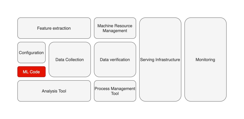 In a paper published by Google on the hidden technical debt of building an AI/ML enterprise system; building an ML model only constitute a small fraction (in red box below) of the overall effort. Data collection, feature extraction, infrastructure management for deployment model, effective model performance and log monitoring are some of the key efforts a data scientist has to face in order to make an end-to-end prediction system.