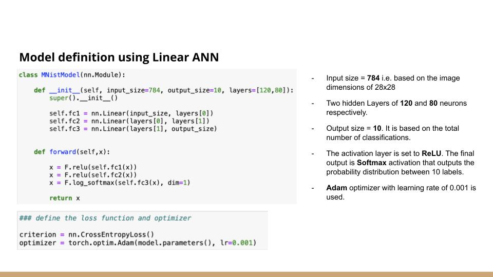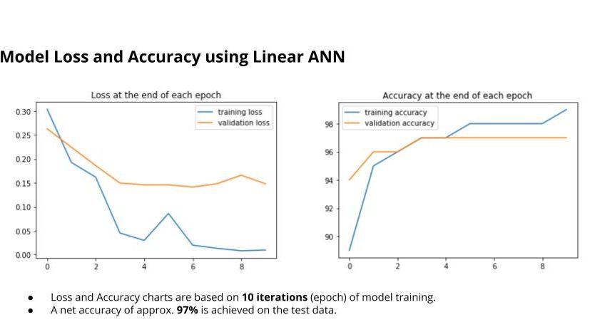 While training the flattened MNist dataset, two Feed-forward Neural networks were applied with the desired output to be 10 (for the 10 digits). The activation layer is set to ReLU and the final activation is done using Softmax which generates the probability of labels between 0-9.