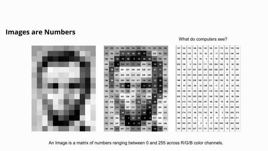 From a computer system perspective, images are just numbers. Images are a combination of binary numbers ranging from 0 to 255. Every pixel square of the images have a number attached to it.
