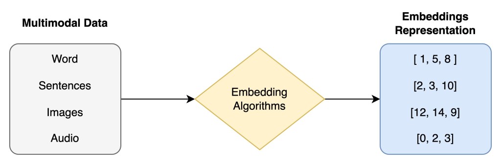 Embeddings are the representation of data. They are represented as vectors that are available for fixed dimensions holding the meaning and context of the data across the vector plane. Embeddings can be of words, sentences, images and audio.