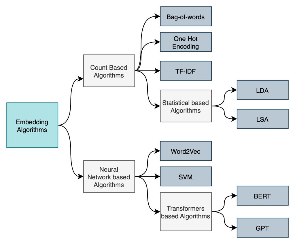 At a high level (below image), data objects (words, sentences, etc.) are split into chunks (or tokens) and then passed through an embedding algorithms to generate the relevant embeddings. The initial embedding algorithm approaches looked at counting the number of tokens and then mapping the vectors against each tokens. With the advancement in the deep-learning algorithms and the transformer architectures, the embedding algorithms started to generate representations that stored contextual information and details.