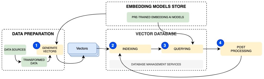 - Vector Search: This is the last stage of the process, which given a query vector returns the most similar vectors.